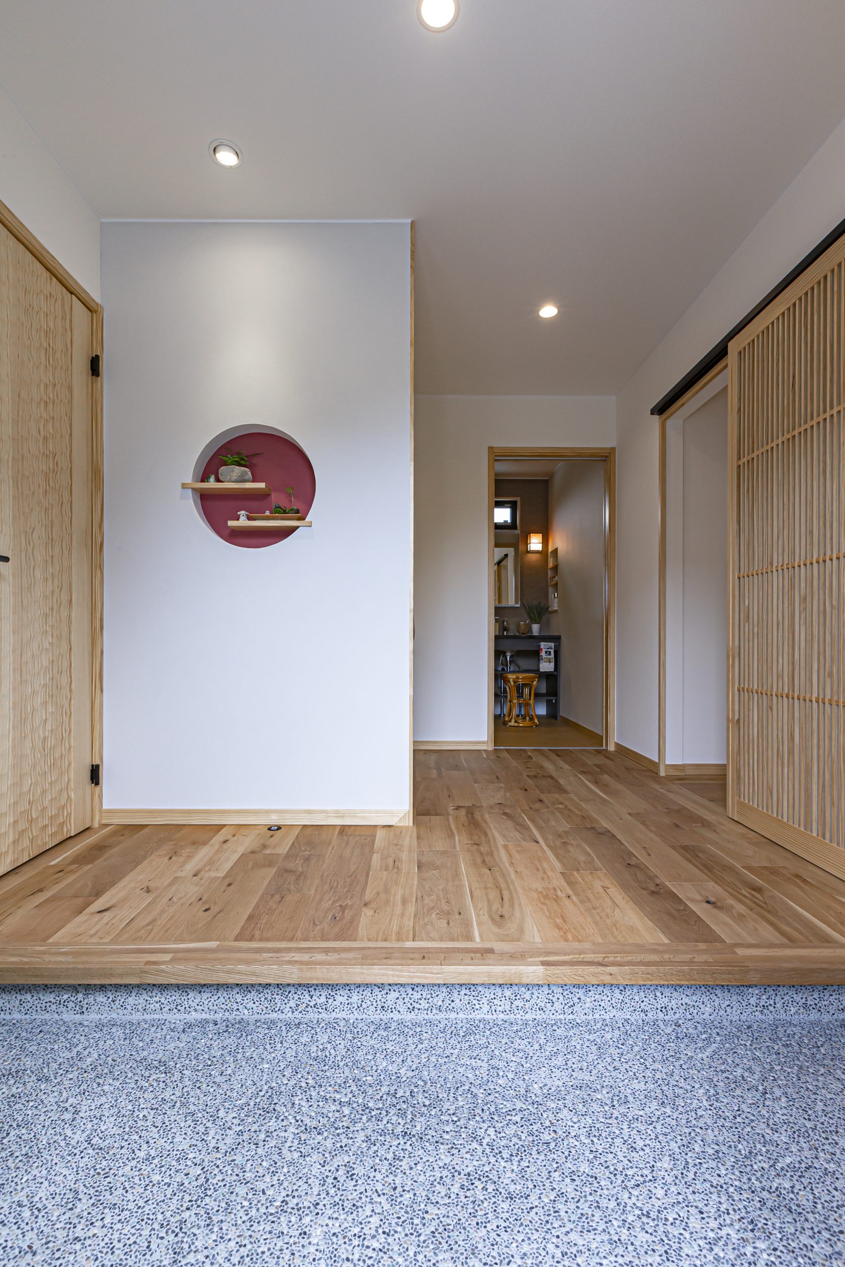 玄関を入ると日の出をイメージした丸いニッチが目を引きます。朱色の漆喰はよく見るとグラディエーションになっています。左官職人のこだわりを感じます。