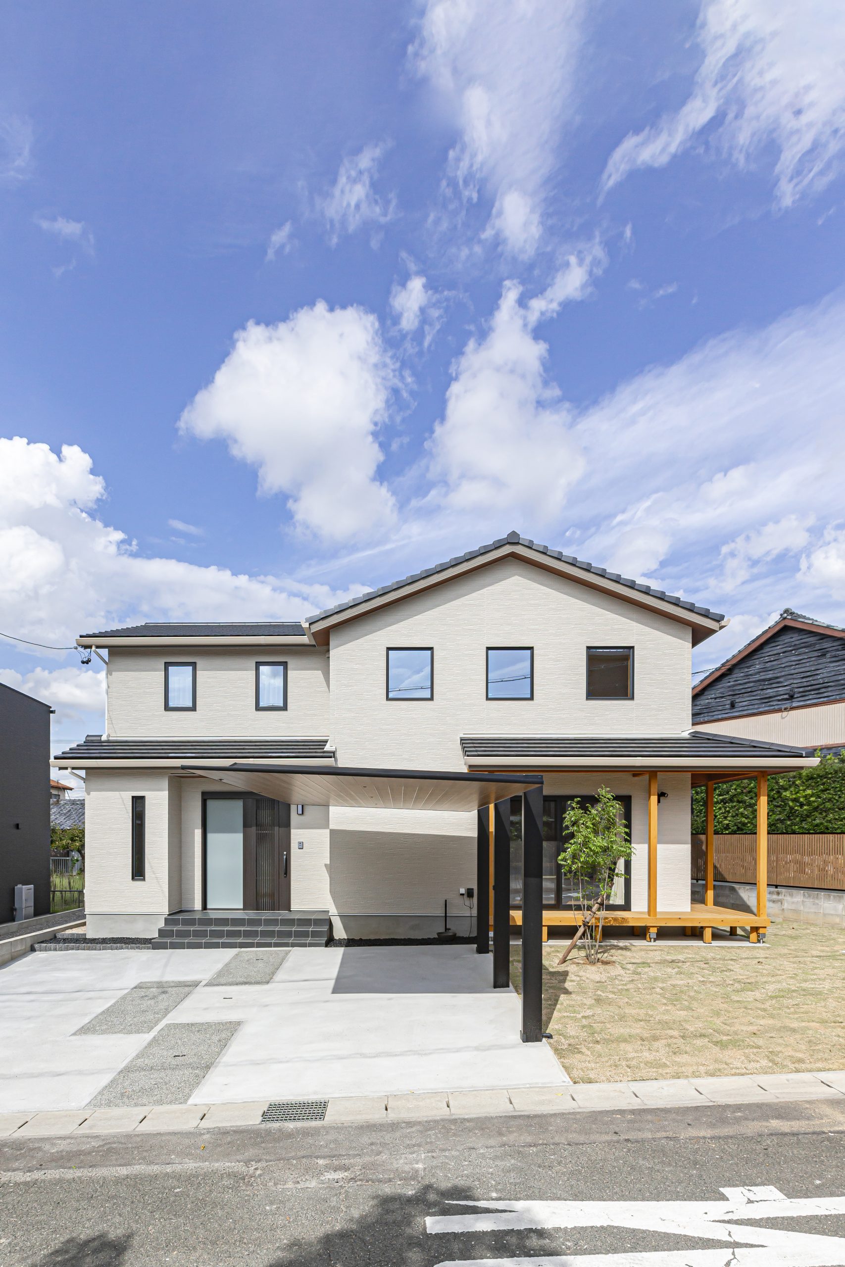 白い外壁に黒の瓦やサッシを取り入れシンプルながらも重厚感あふれる外観が目を引きます。