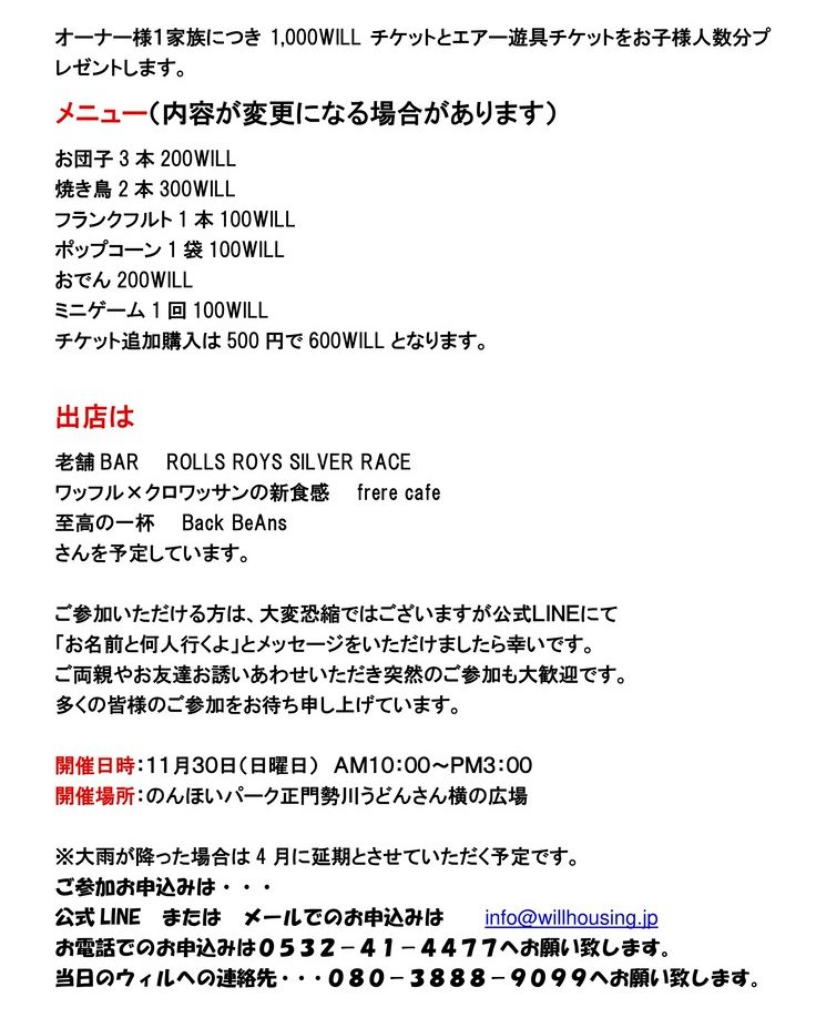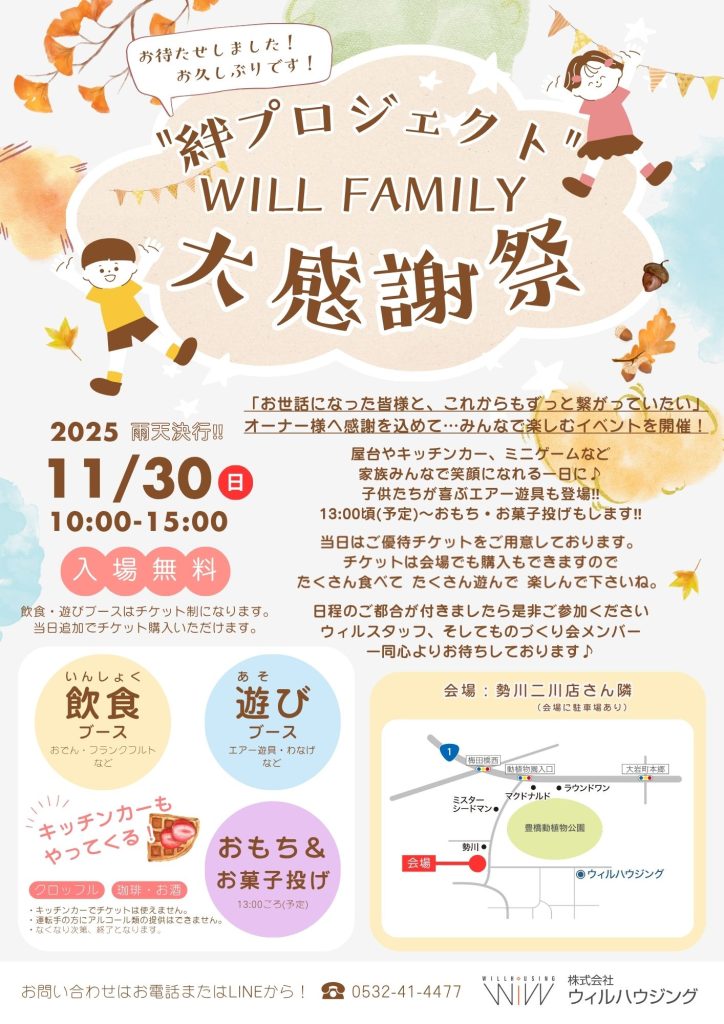 11月30日(日)に「WILL FAMILYお客様大感謝祭」を開催いたします。