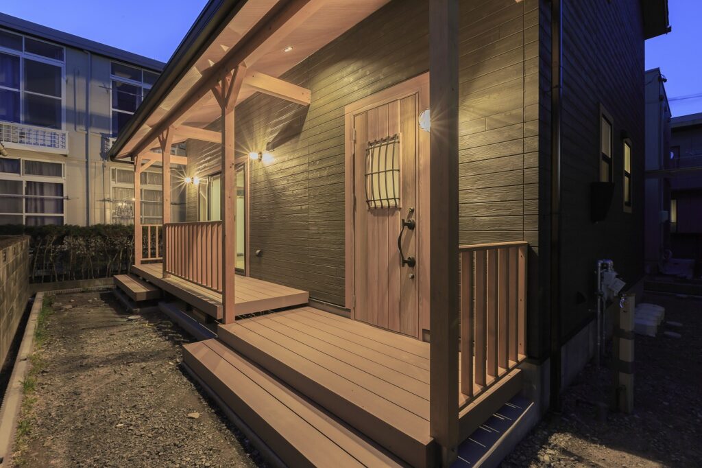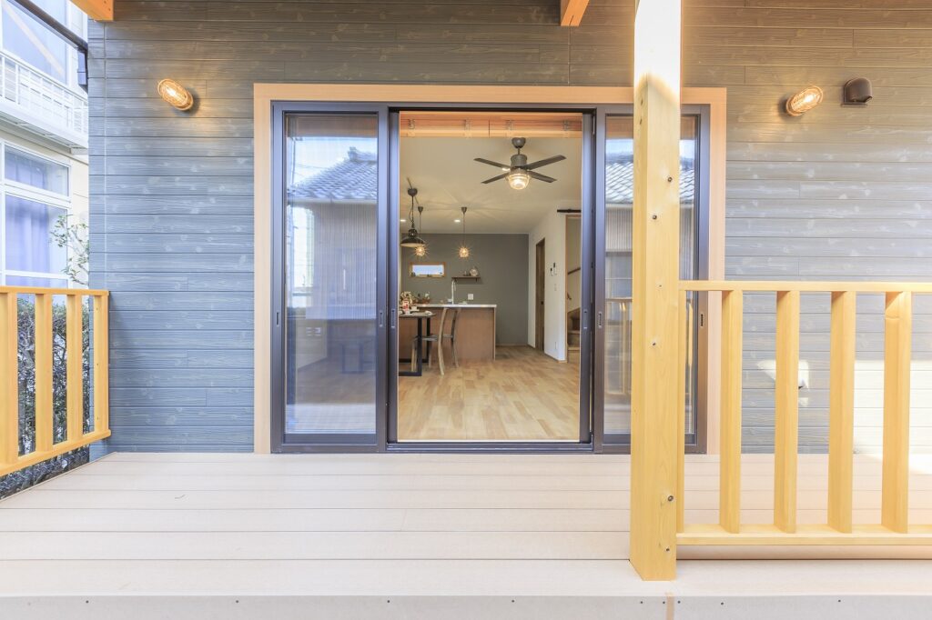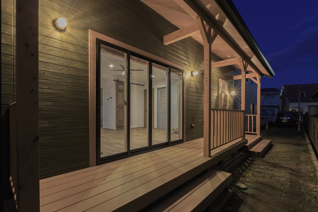リビングと広々としたカバードポーチをつなぐ大きな窓は解放感があり、壁付けのマリンライトもオシャレですね。