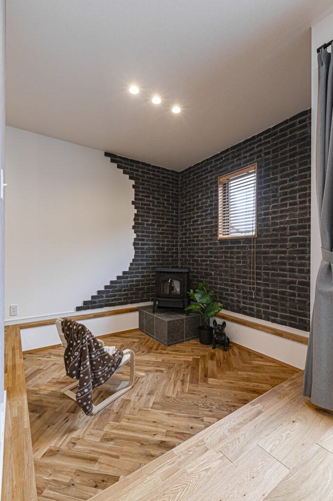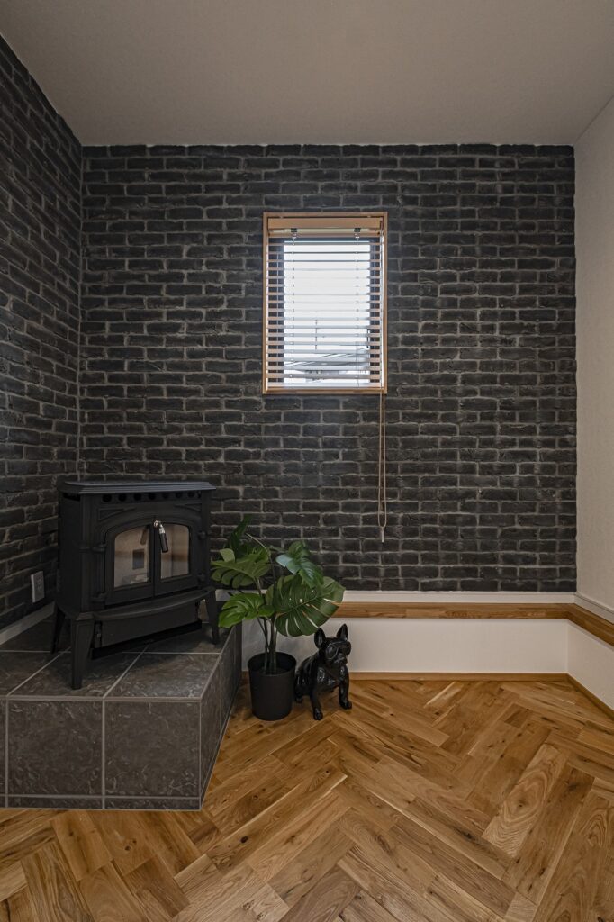 ペレットストーブのあるヴィンテージモダンな家
